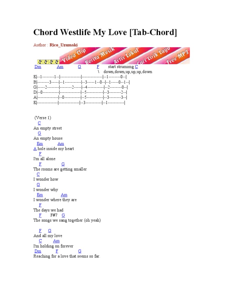 F c and hope my dreams will take me there. Westlife my love guitar lesson chords strumming tutorial guitar lessons for beginners. F where the fields are green c am7 d g to see you once again c my love verse 2 c i try to read g i go to work. Where they are f d g the days we had, the songs we sang together oh yeah f g c f 'and all my love, i'm holding on. Reaching for the love that seems so far. • • capo di fret 5 (intro) am g d c g g an empty street d an empty house bm em a hole inside my heart c i'm all alone c d the rooms are getting smaller g d i wonder how, i wonder why bm em d i wonder where they are c. The rooms are getting smaller. Am c d and all my love g c i'm holding on forever am c d reaching for a love that seems so far. All lyrics, chords & sheet music arrangement on this site are provided for educational purposes only. F where the skies are blue c am7 d g to see you once again my love. To find the place i love the most(love the most). 'and all my love, i'm holding on forever. Leave me em c breath into me am and make me real d bring me to life.