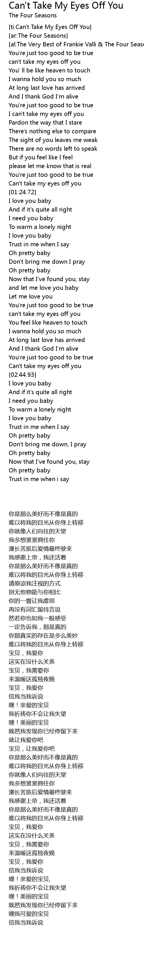 Berikut ini lirik lagu barat yang terfavorit, can't take my eyes off you dari frankie valli. Can't take my eyes off you. Terjemahan dan arti lirik lagu can't take my eyes off you dari frankie valli. Berikut lirik lagu i need . 'soko de warattete kurenai ka?'chiisai koro hoshi no kazu hodo yume o mitewatashi ga nozomeba nan demo te ni hairu to omottetademo hoshii mono wa zenbu .